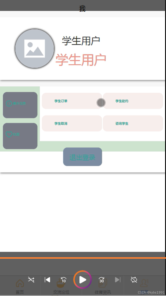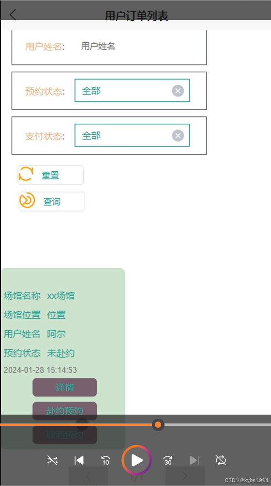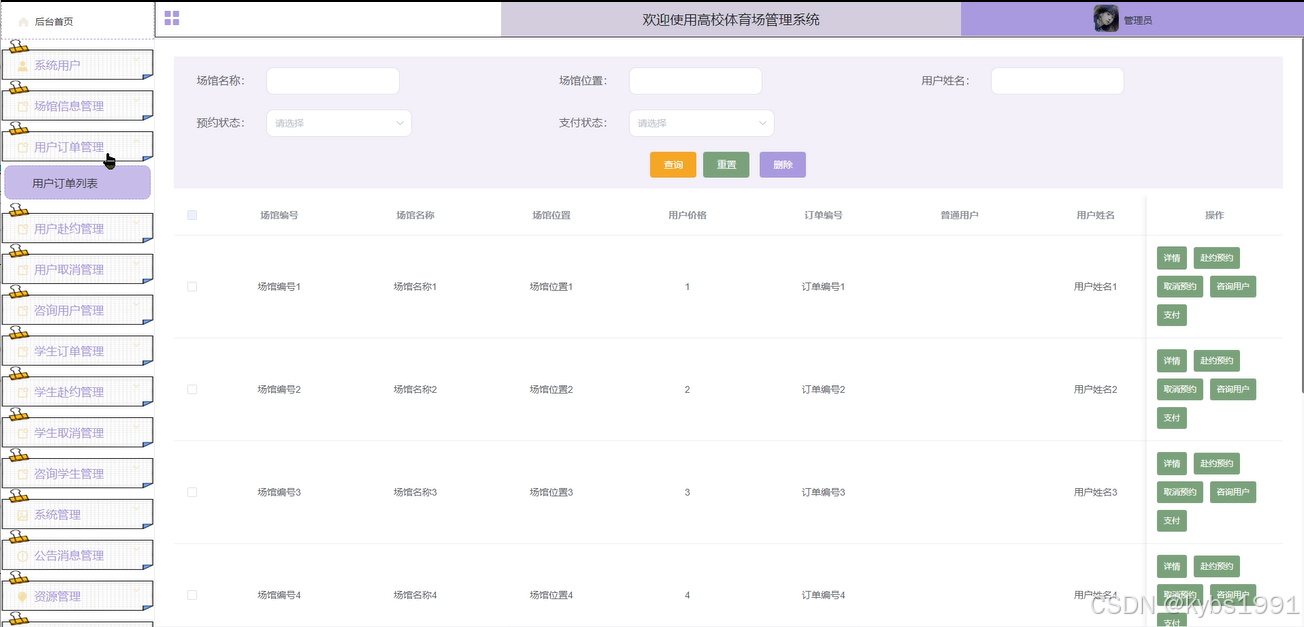 用户订单:在“用户订单”板块,学生用户可以查看自己所有的订单记录,包括已预约的场馆、订单状态、支付情况等。用户还可以根据自己的需求进行订单的支付、预约或取消等操作。这一功能为用户提供了极大的便利性,让他们能够随时掌握自己的订单状态并进行相应的处理。界面图如下。