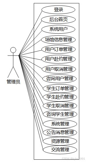(11)学生取消管理:管理员负责处理学生取消信息,包括展示取消列表、查看详细信息、进行查询、重置和删除等操作,支持通过场馆名称、位置和学生姓名进行搜索,以便及时处理取消请求。