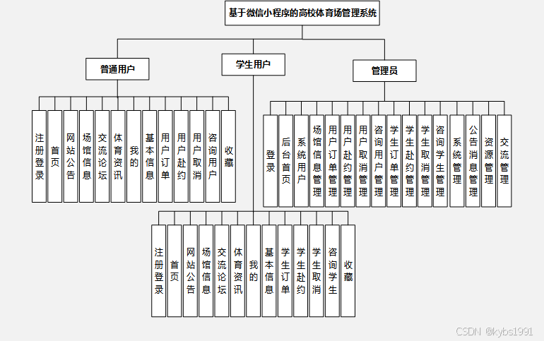(3)在基于微信小程序的高校体育场管理系统中,首先要确定系统的技术,然后进行在线确认,以确定系统的用户角色,并根据这些角色划分出相应的功能模块。系统的设计主要将用户分为管理员、学生用户和学生用户角色,每个角色都有其独特的特点,而且每个功能模块都有其特定的功能,但是系统的数据库都是交互式的,用户可以随时根据自身的需求查看户外相关信息,而系统的工作人员则可以根据自身的职责,处理和操作在线信息。管理员可以快速收集用户的详细信息,并能够在第一时间响应用户的需求。