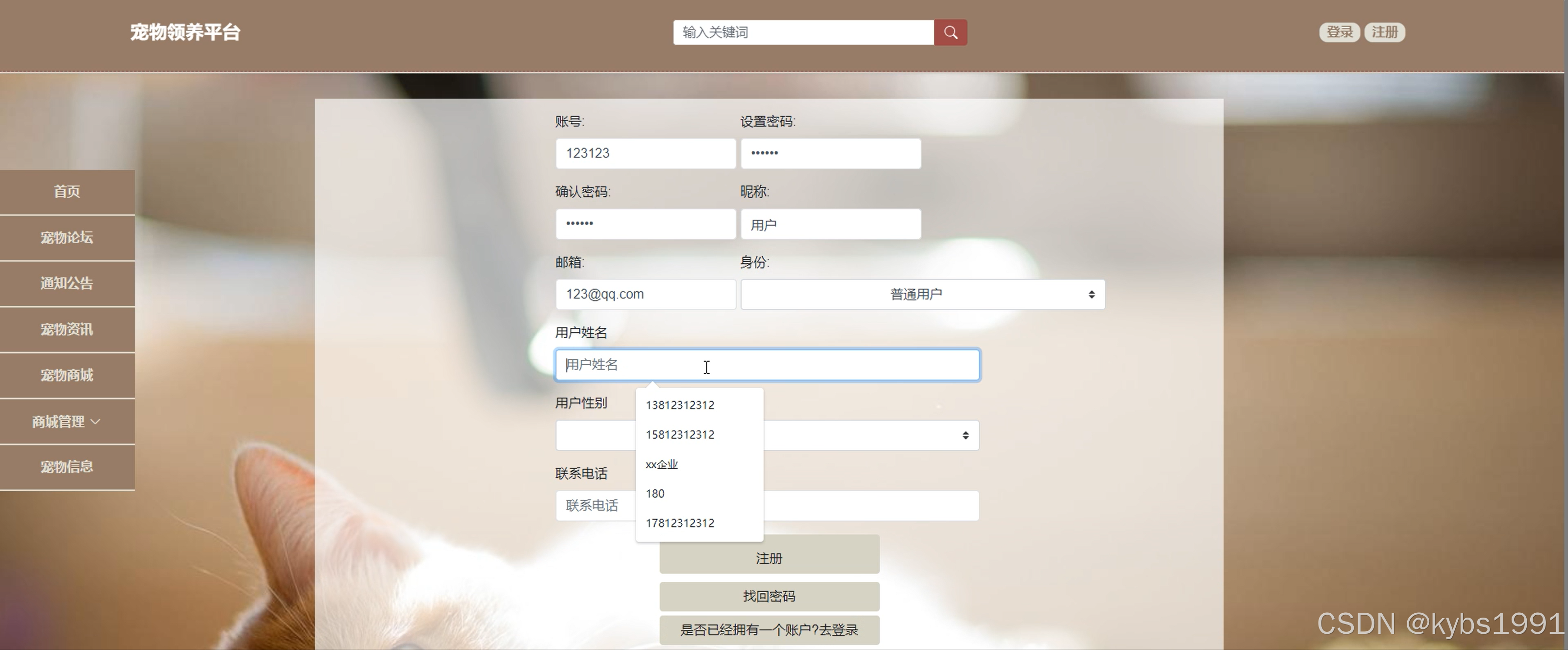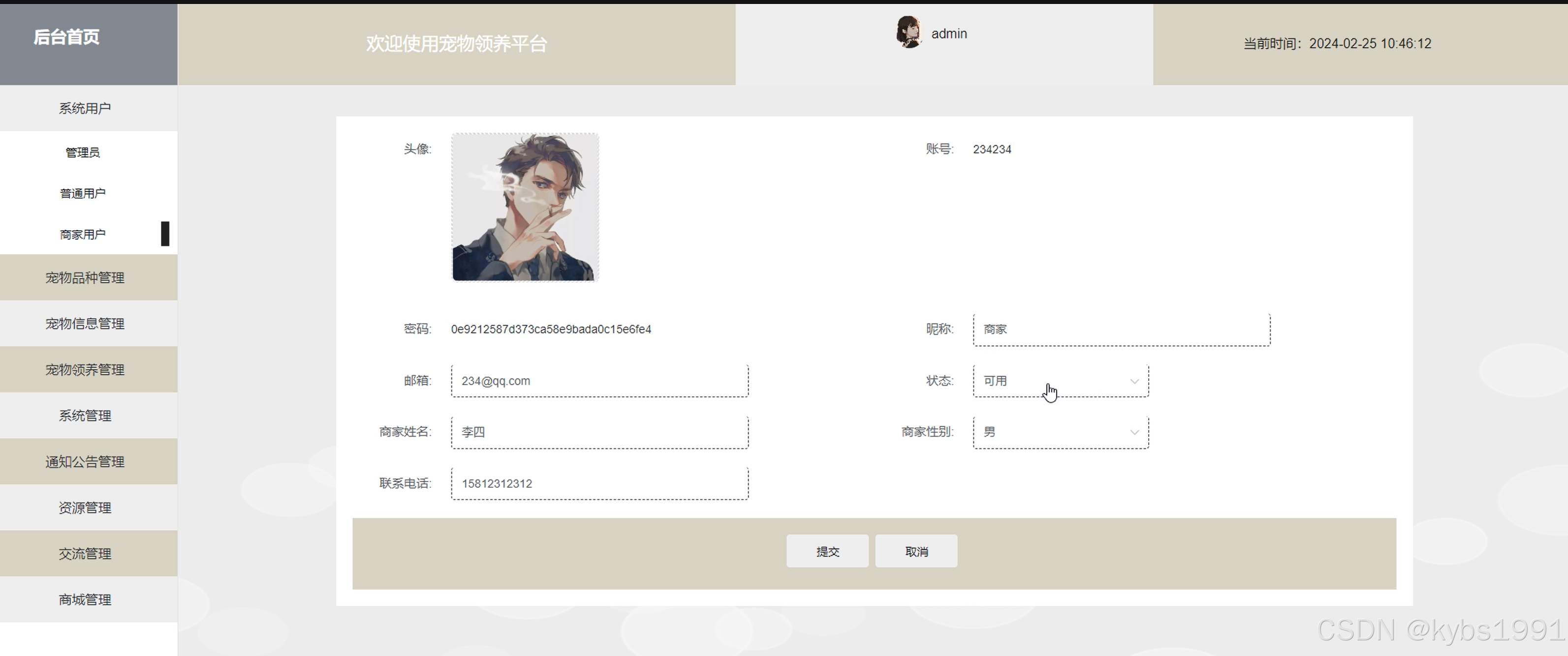 商家用户管理:对商家进行管理,商家的注册,包括商家昵称、商家名、商家的宠物信息(宠物类别、性别、年龄等)商家的账号信息:
