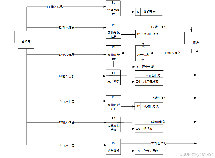 宠物领养系统底层数据流图主要描述系统底层模块的数据流、数据载体、数据处理、外部实体的具体交互。本系统就是管理员和普通用户在用户管理、宠物领养、宠物认领、饲养视频管理等模块上的数据交互。