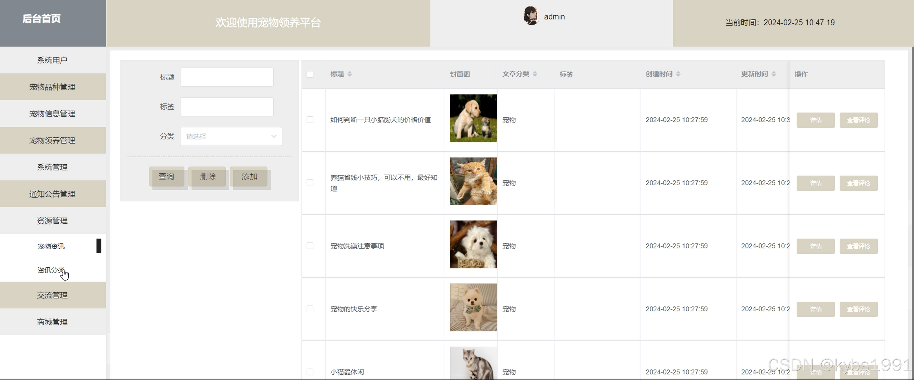 图4-9宠物资讯管理界面