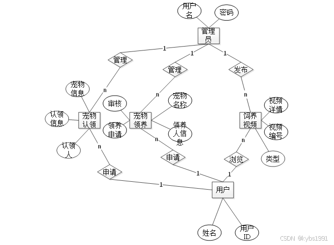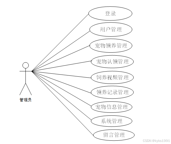 3.管理员主要负责用户管理、宠物领养管理、宠物认领管理、饲养视频管理,下图所示描述管理员的用例图。