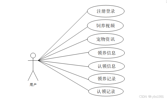 1.普通用户主要使用系统进行宠物领养以及宠物的认领,下图所示为普通用户的用例