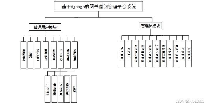 按照基于django的图书借阅管理平台的角色,系统划分为了普通用户模块和管理员模块这两大部分。
