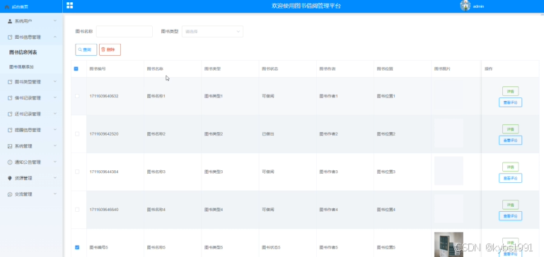 管理员点击“图书信息管理”菜单,可以管理图书的信息,包括查询、详情和查看评分。界面如下图4-8所示。