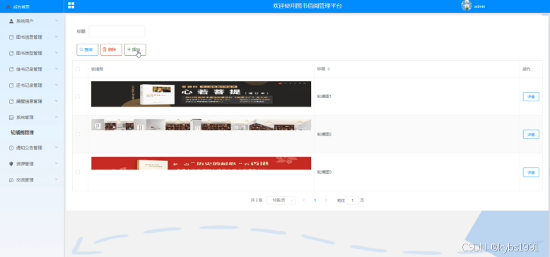 管理员点击“系统管理”这一菜单会显示轮播图这一个子菜单,管理员可以对前台展示的轮播图进行设置,界面如下图4-7所示。