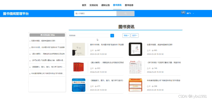 当用户点击“图书资讯”后,可以查看系统发布的图书资讯列表,点击可以查看资讯详情信息,可以进行点赞、收藏、评论等操作。界面如下图4-3所示。