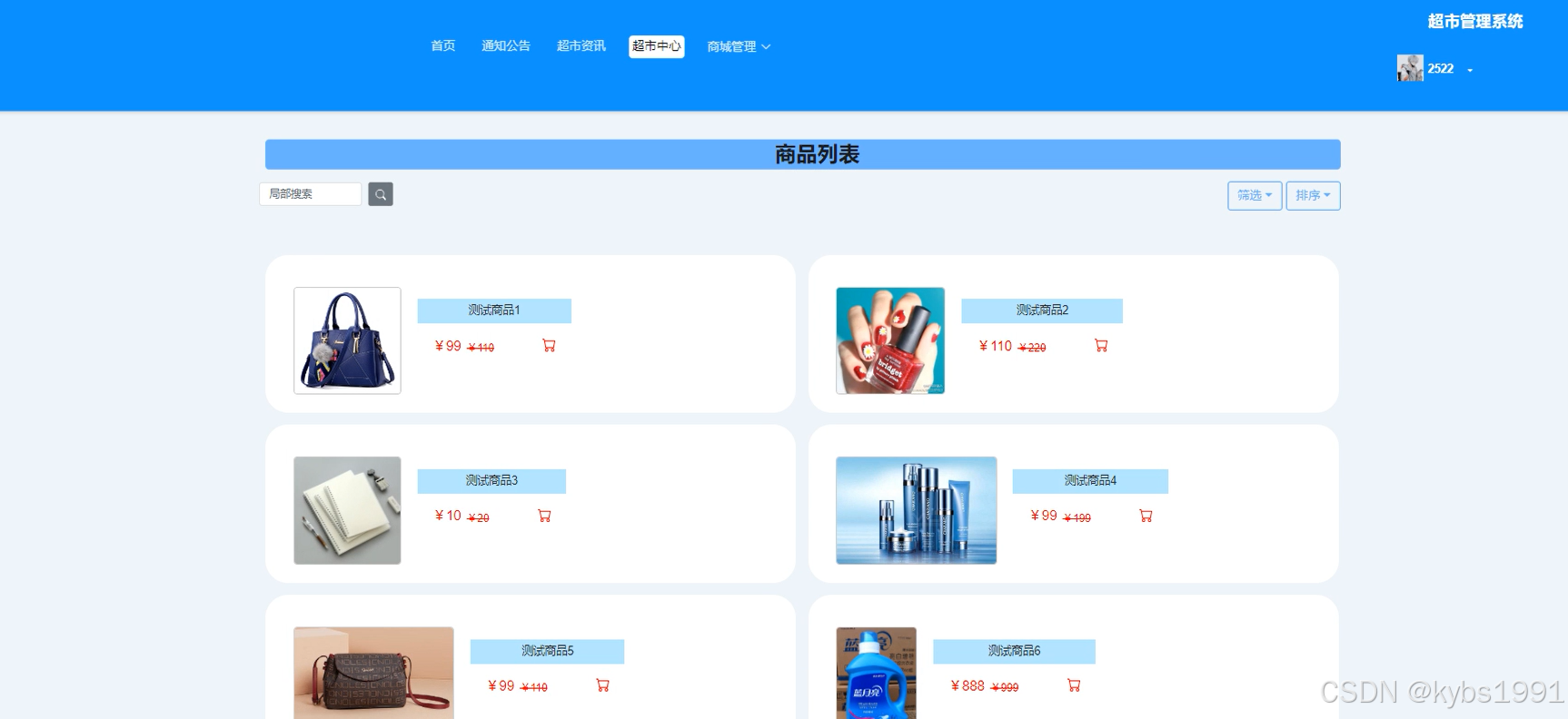 注册用户点击“超市中心”菜单,可查看超市中心商品列表的信息,可以进行商品的搜索、筛选和查看详情。并加入购物车或点击购买。界面如下图所示。