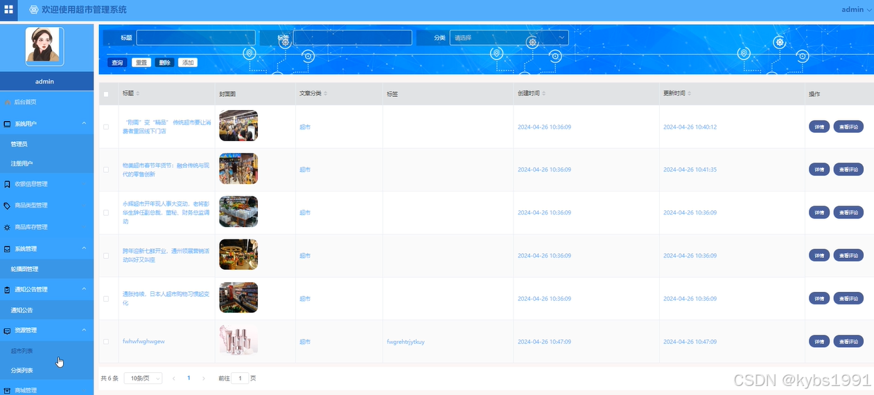 资源管理:管理员可以管理超市列表的数据信息,最新资讯以及分类,包括超市名称、地址、联系方式等。