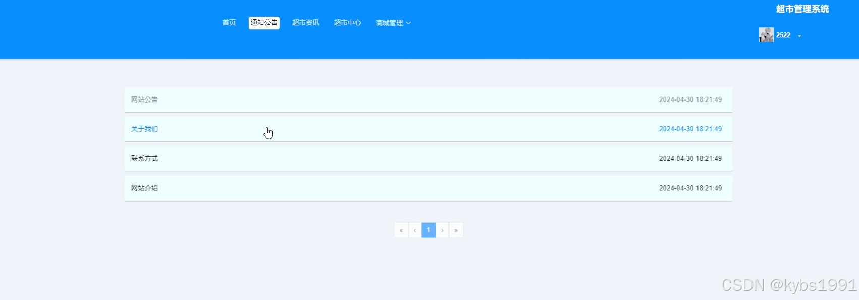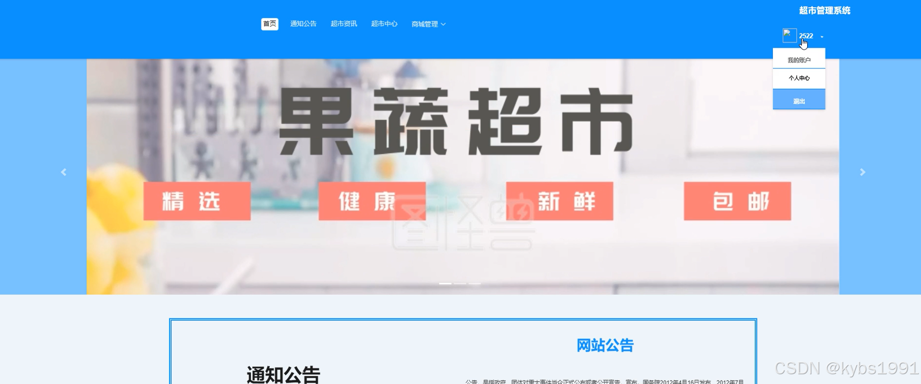 首页:用户登录后的系统入口页面,展示最新的通知公告和超市资讯。