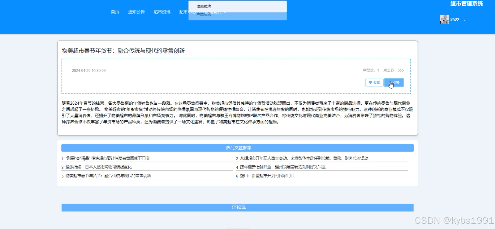 当用户点击“超市资讯”后,用户可以在资讯详情页面查看、收藏、点赞、评论该资讯,界面如下图所示。