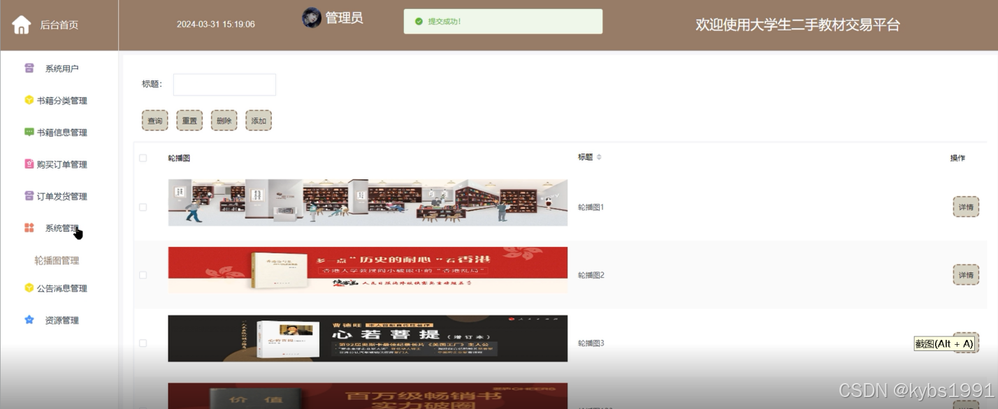 (3)书籍信息管理:管理员可以对已发布的二手教材进行管理,包括审核发布、编辑修改、下架处理等操作。