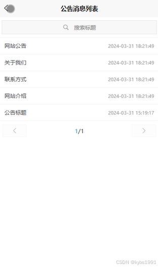 当访客点击大学生二手教材交易平台中导航栏上的“通知公告”后将会进入到该“通知公告”列表的界面,然后选择想要看的通知公告,点击进入到详细界面。通知公告列表展示界面如下图所示。