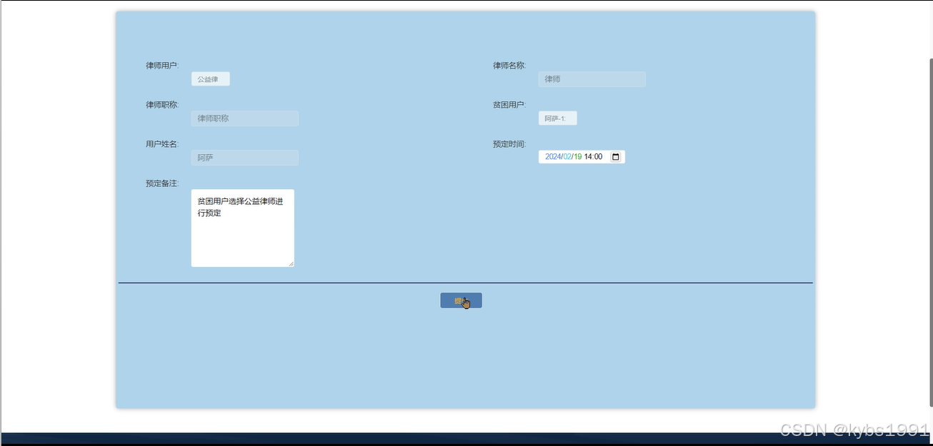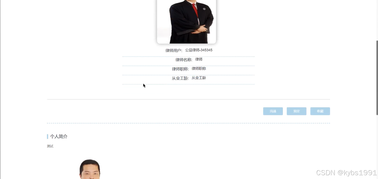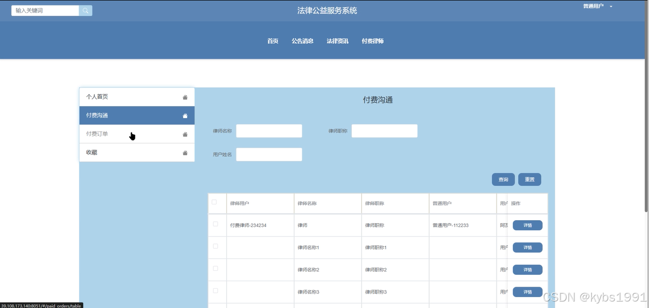 (5)付费律师: 普通用户对应付费律师,用户可以查看所有得付费律师信息,在查询到自己想要了解的律师信息的时候,可以进入查看详细的介绍,点击“预定”这一按钮以后会跳转到预定信息填写的界面,根据提示填写好预定信息,点击“提交”以后预定信息就完成了,同时还可以根据需要进行“沟通”,点击“沟通”这一按钮以后会跳转到沟通信息填写的界面,根据提示填写好沟通信息,点击“提交”以后沟通信息就完成了,在付费律师这个界面,同时支持用户对付费律师信息进行收藏、点赞以及评论的功能。