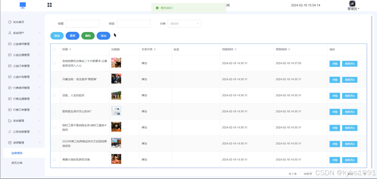 (4)法律资讯:用户可以查看系统所有的法律资讯内容,并进行点赞、收藏、评论等操作。