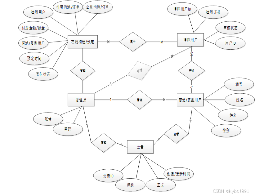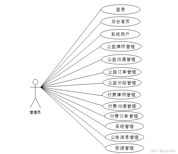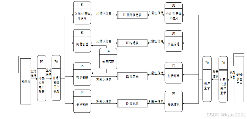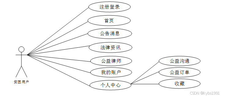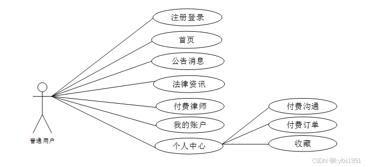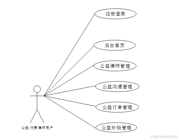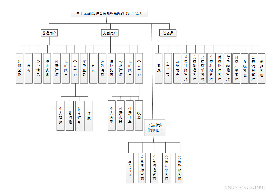 法律公益服务系统我划分为了普通用户模块、贫困用户模块、律师用户(公益、付费律师)模块和管理员模块这四大部分。