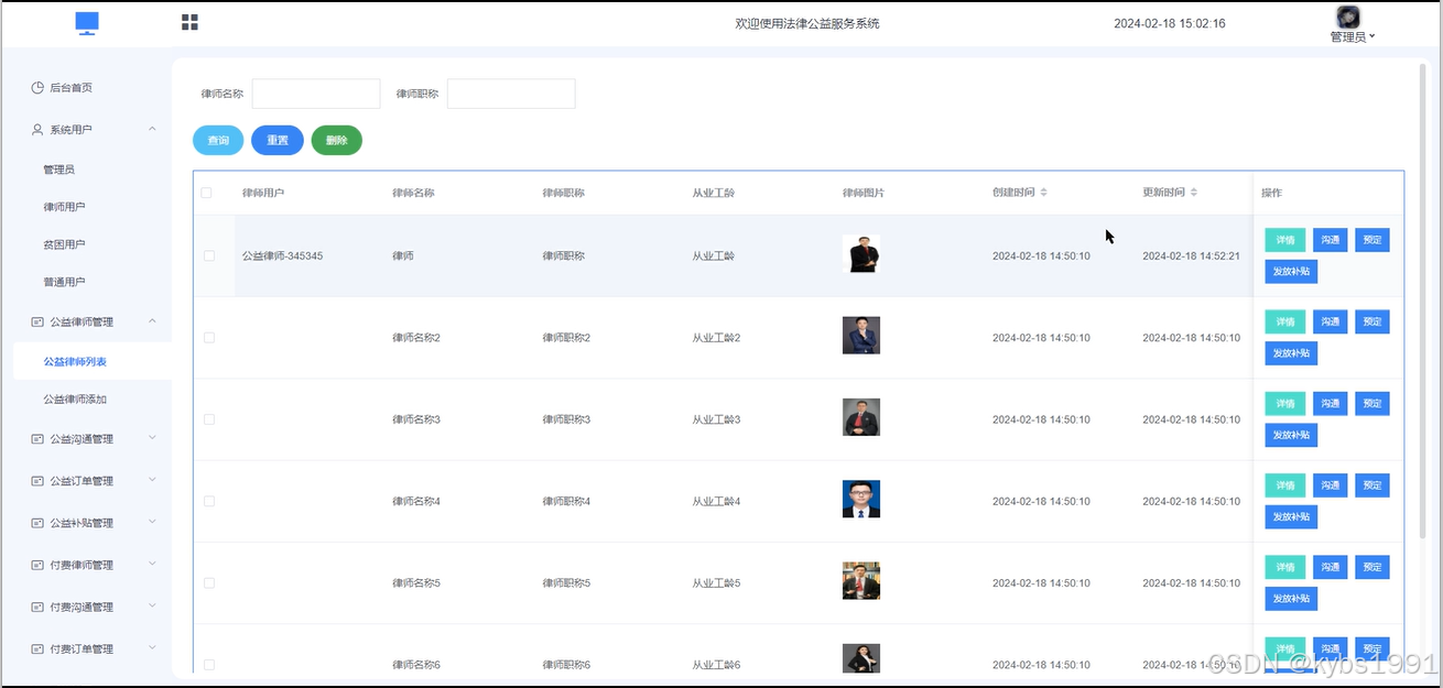 (2)公益律师管理:管理员对公益律师管理列表进行详情查看、支持通过输入律师用户、律师名称、律师职称、从业工龄、律师图片、个人简介等进行新增添加,并对沟通、预定、发放补贴(对公益律师发放补贴)等进行管控,根据需要进行查询、重置、删除等。