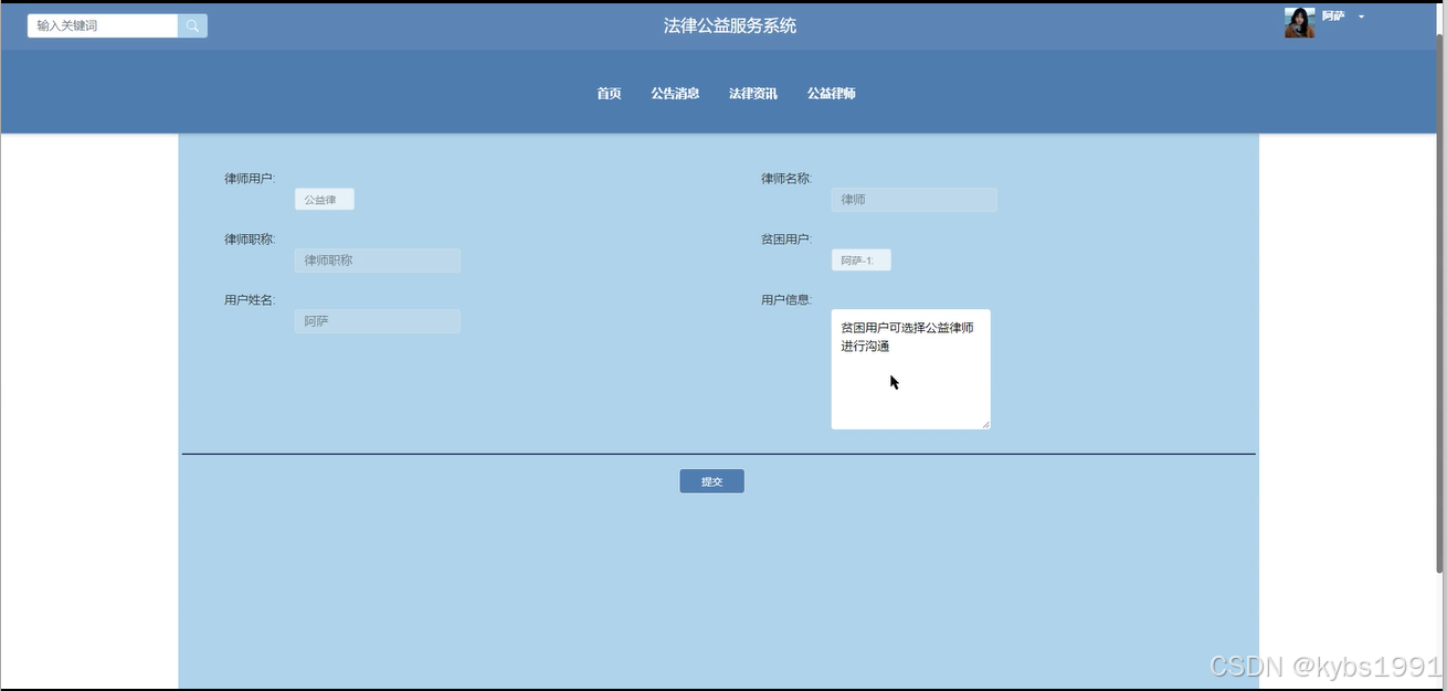 | 预期结果 | 提交以后,页面首页会显示新的公益律师信息 |