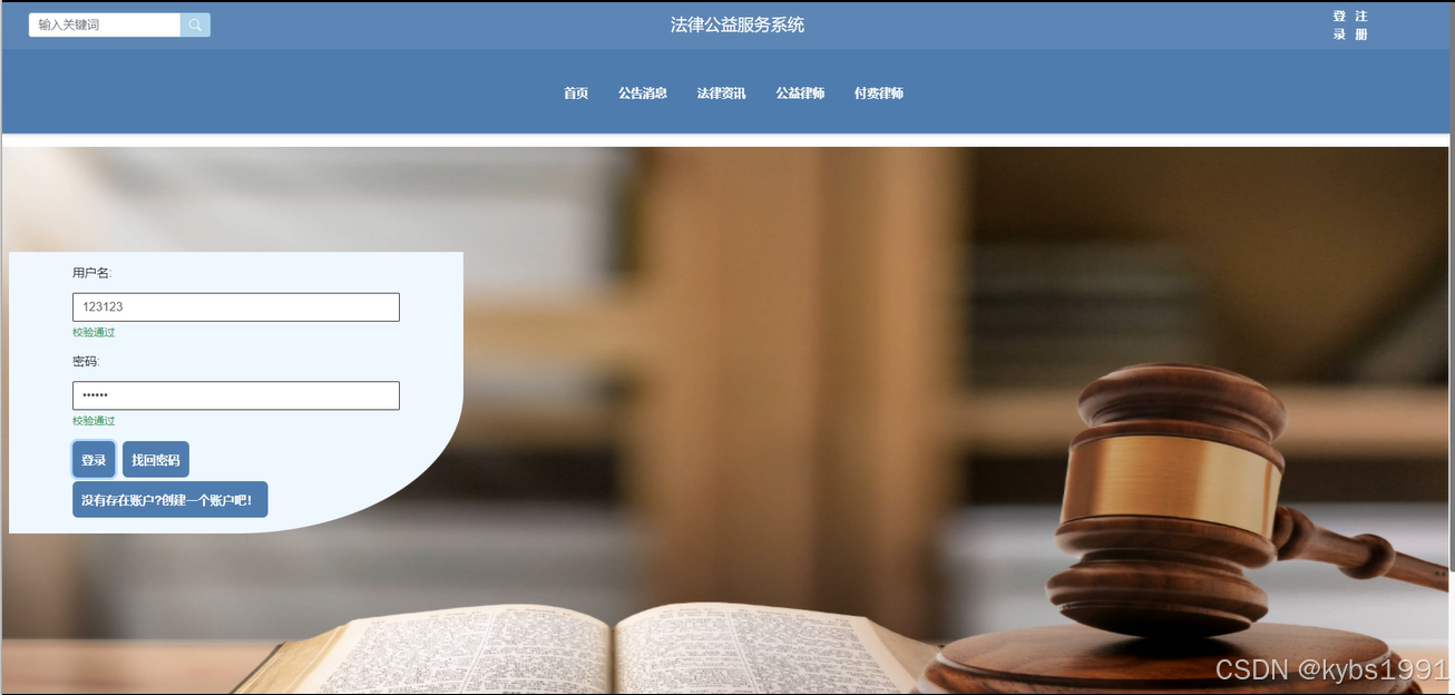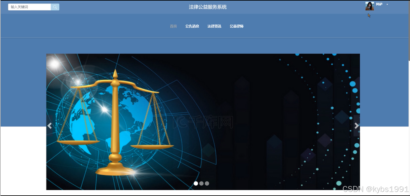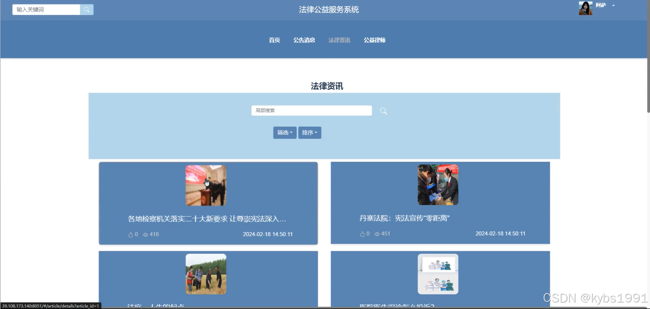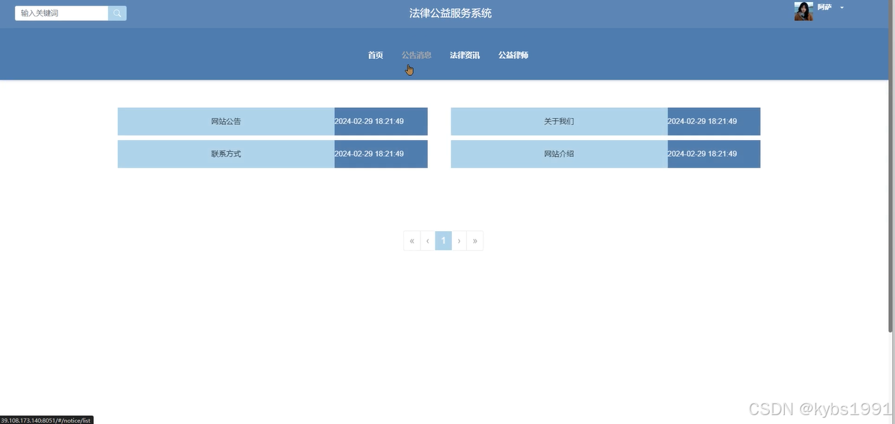 (2)查看法律公益服务系统的首页信息:法律公益服务系统的首页信息包含了首页、公告信息、法律资讯、公益律师、我的账户、个人中心等。