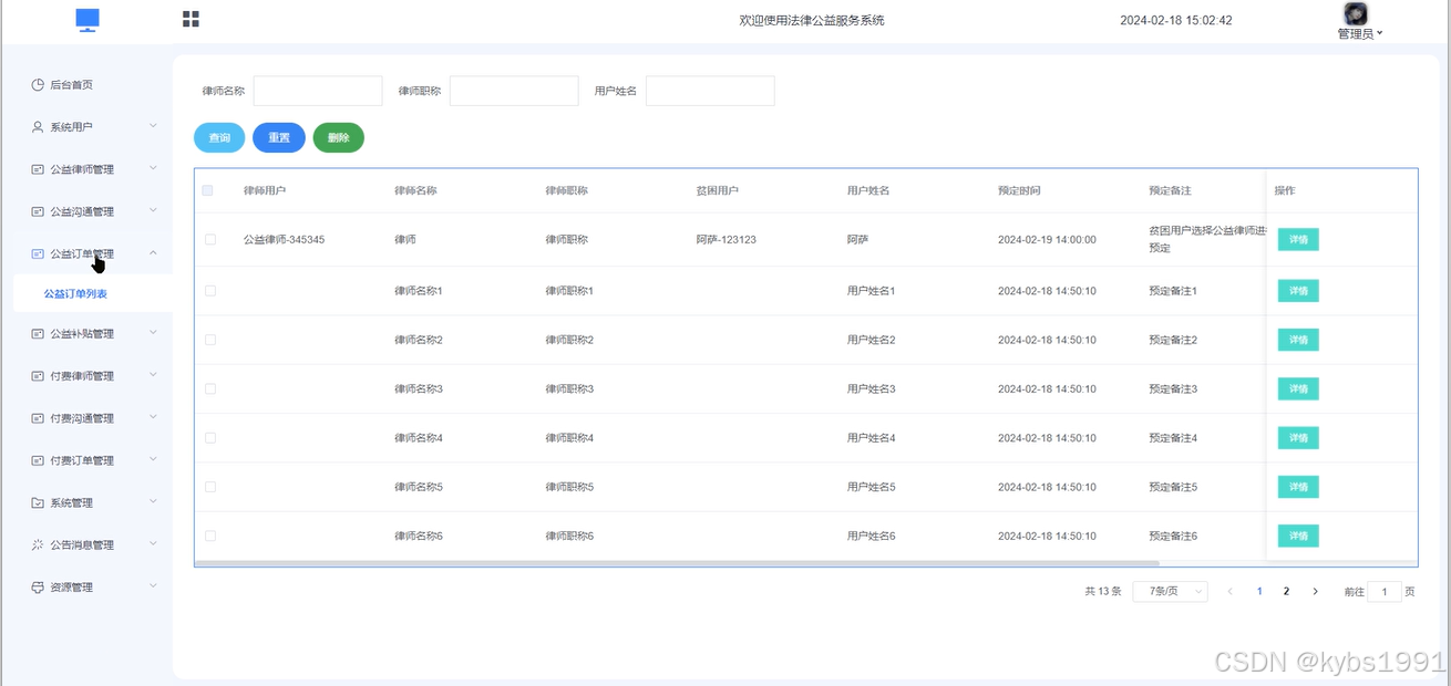 (1)公益律师管理: 公益律师对公益律师管理列表详情查看,并根据需求进行重置+查询等操作。