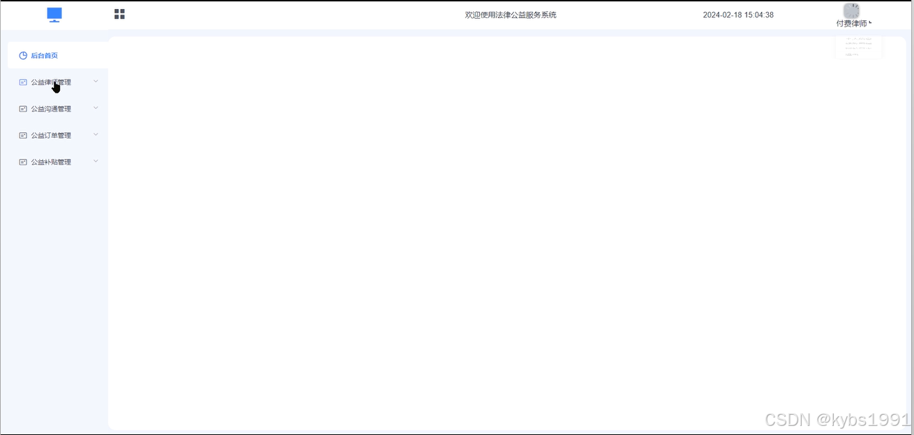 律师后台包含付费律师跟公益律师,付费律师的后台包含后台首页、公益律师管理、