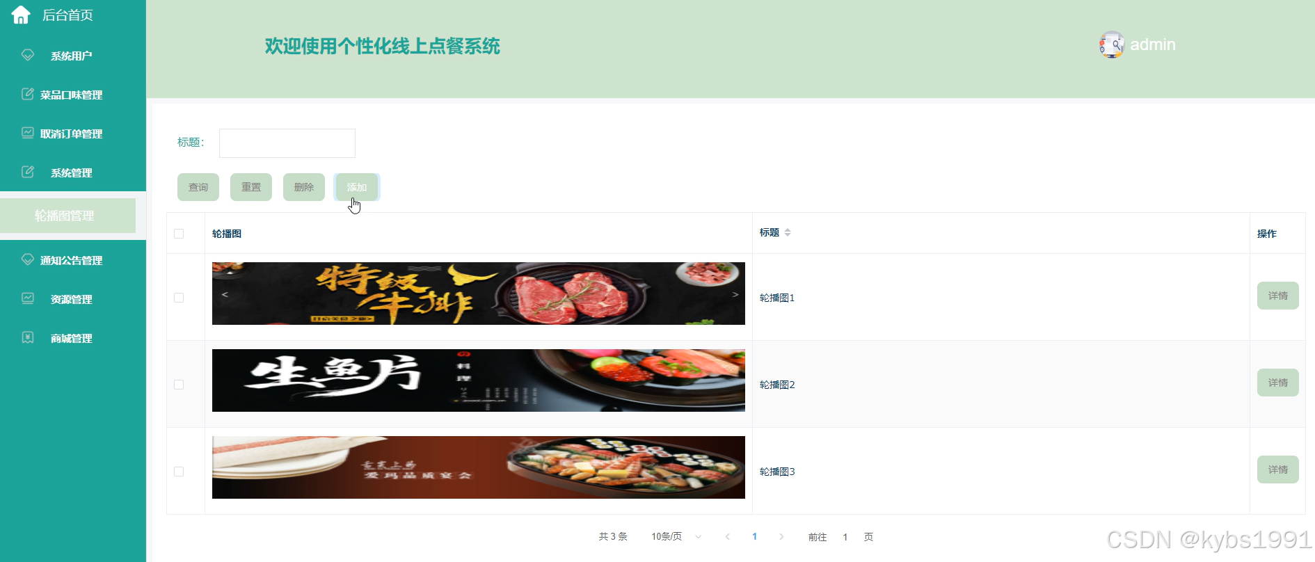 系统管理,个性化线上点餐系统中的管理人员在系统管理页面可以查看轮播图信息,并根据需求进行查询、删除等操作。系统管理界面如下图所示。