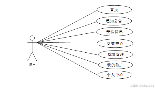 系统用户进入系统可以进行首页、通知公告、美食资讯、商城中心、商城管理、我的账户、个人中心等功能操作。系统用户用例如图3-8所示。