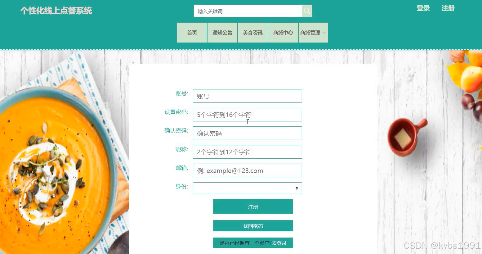系统的用户通过自行注册生成,在系统首页点击用户注册菜单,系统跳转到对应的注册页面。点击重置按钮,清空所填数据,点击注册按钮完成注册。用户注册的时候添加菜品口味,为了方便系统在首页的商城中心给用户推荐相对应的菜品口味下面的菜品。用户注册界面如下图所示。