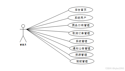 系统中的核心用户是系统管理员,管理员登录后,通过管理员菜单来管理后台系统。主要功能有:后台首页、系统用户、菜品口味管理、取消订单管理、系统管理、通知公告管理、资源管理、商城管理等功能。管理员用例如图3-7所示。