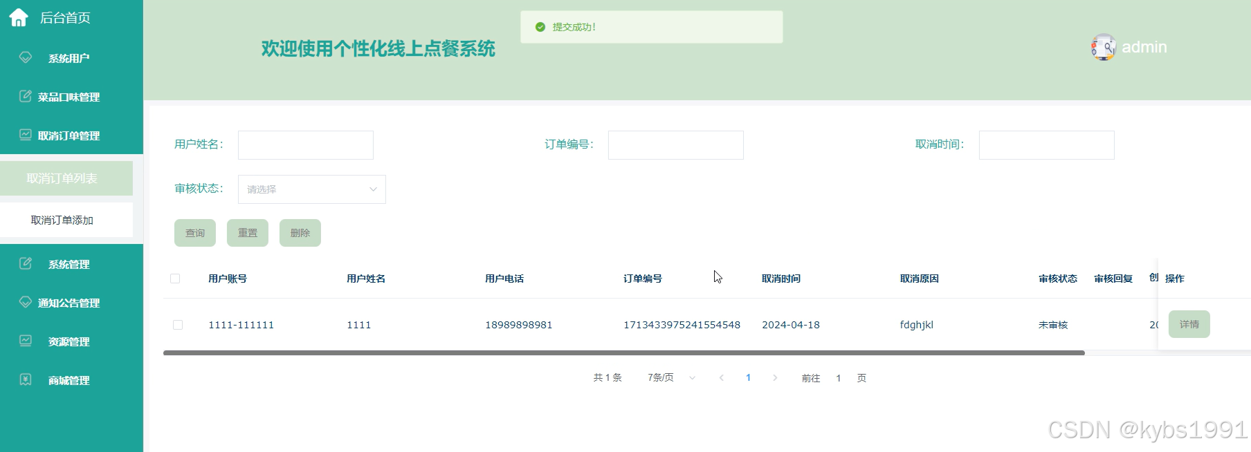 取消订单管理,个性化线上点餐系统中的管理人员在取消订单管理页面可以查看取消订单列表和取消订单添加等内容,并根据需求进行查询、重置、删除等操作。取消订单列表界面如下图所示。