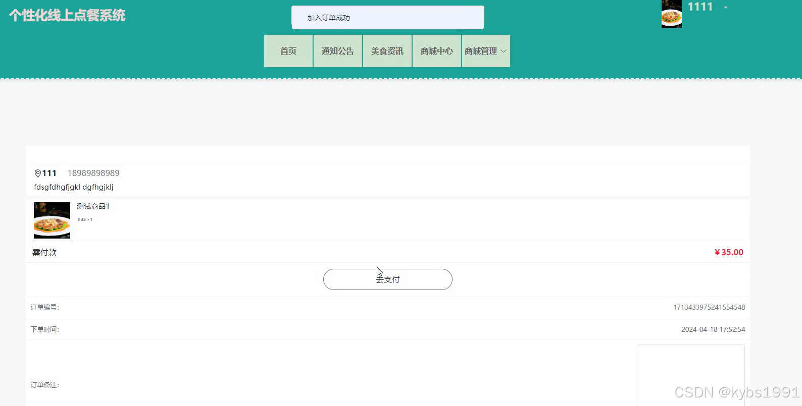 当用户点击个性化线上点餐系统中导航栏上的商城管理后可以查看我的购物车、我的订单、我的地址等信息,并进行相应的操作。
