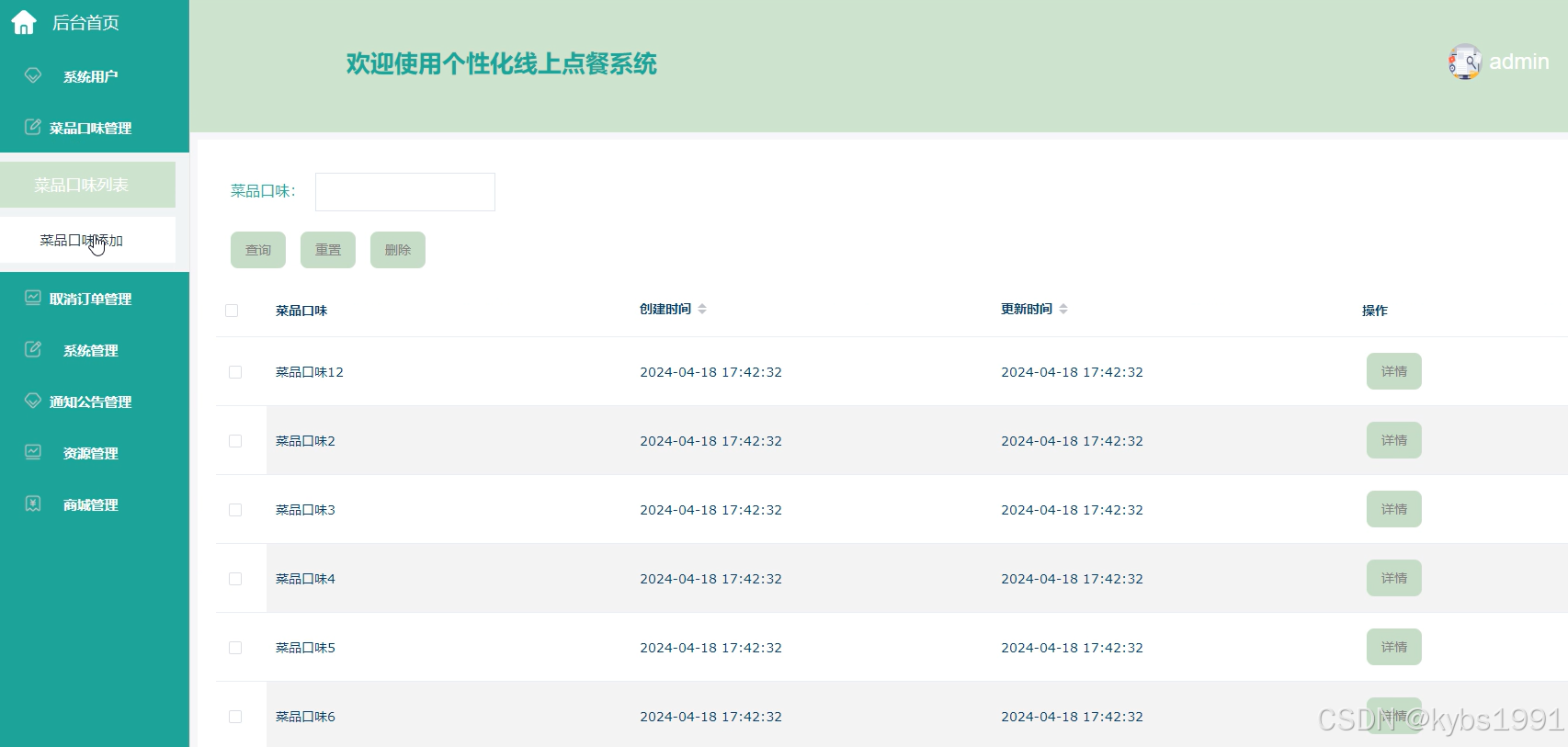 菜品口味管理,个性化线上点餐系统中的管理人员在菜品口味管理页面可以查看菜品口味列表和菜品口味添加等内容,并根据需求进行查询、重置、删除等操作。菜品口味列表界面如下图所示。