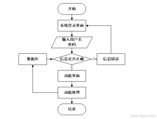 用户打开并进入系统后,会先显示登录界面,输入正确的用户名和密码,系统自动检测信息,若信息无误,则用户会进入系统功能界面,进行操作,否则会提示错误无法登录,操作流程如图3-3所示。