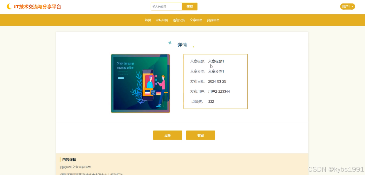 (4)资源信息:当用户点击“资源信息”这一菜单按钮,会显示管理员在后台发布的所有的资源信息,可以查看详情;可以进行点赞、收藏、评论等操作。