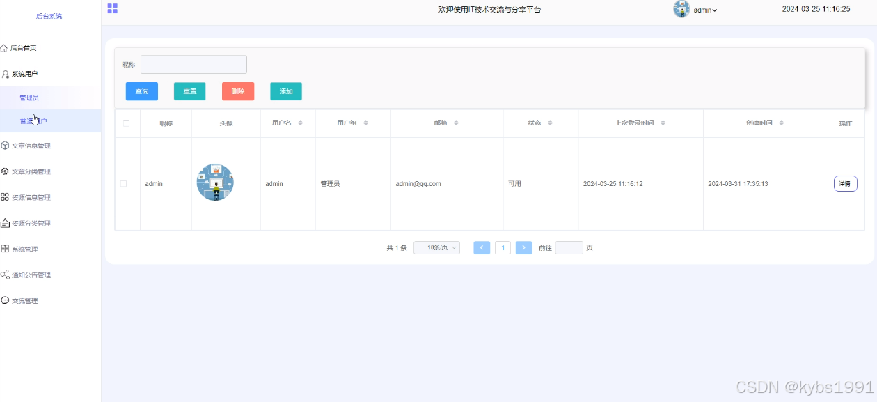 IT技术交流与分享平台中的管理人员是可以对注册的普通用户进行管理的,也可以对管理员进行管控。界面如下图4-6所示。