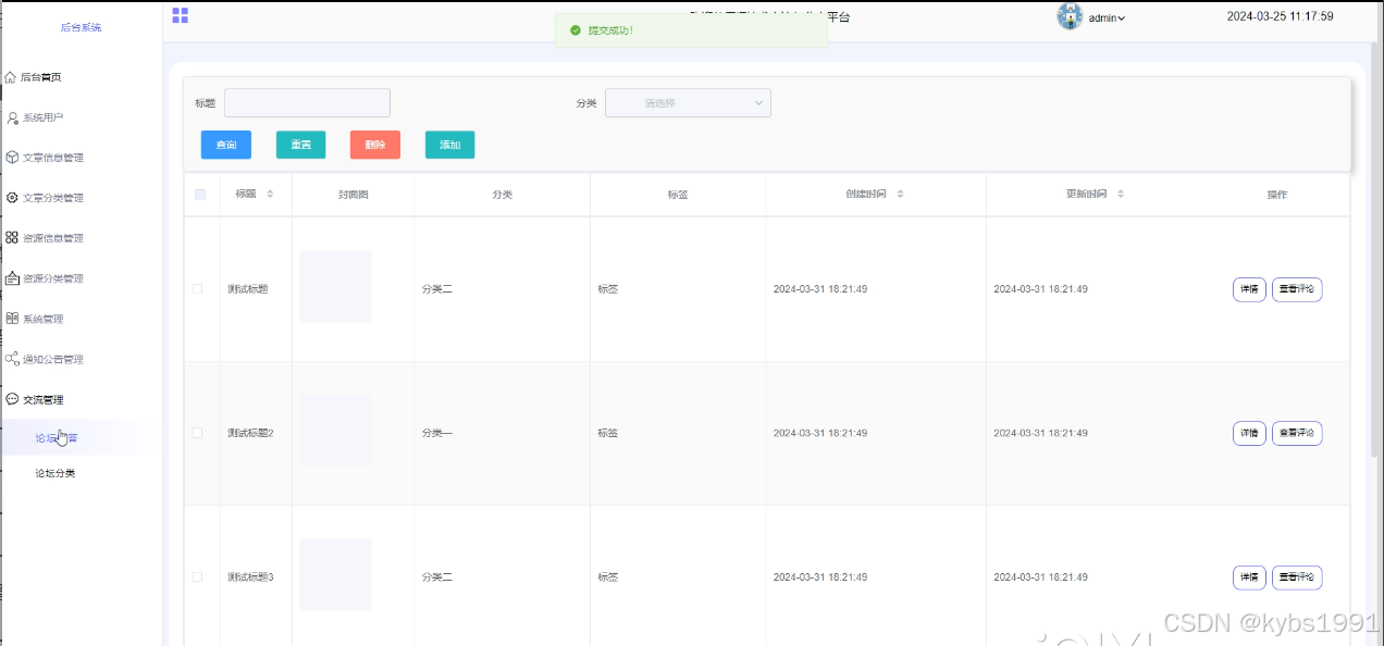 (3)交流管理:进入后台首页工具栏点击“交流管理”这个按钮可以查看所有论坛问答、论坛分类等信息,可以进行详情查看、删除、查看评论等操作。