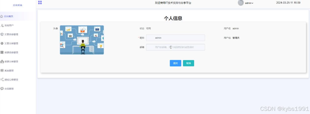 (6)个人信息:管理员和用户点击“个人信息”按钮,可以对个人的头像、昵称、手机号码等信息进行更新。