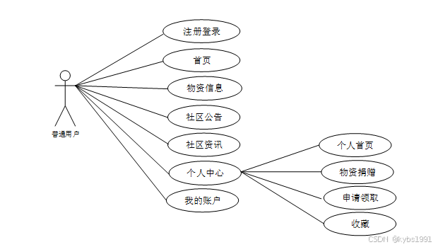 前台的主要功能模块有首页、物资信息、社区公告、社区资讯、我的账户、个人中心等。普通用户登录系统后不仅可以查看社区公告,浏览社区资讯,还可以查看物资信息并进行申领。在个人中心界面还可以对个人首页、物资捐赠、申请领取和收藏信息进行管理。普通用户用例图如下所示。
