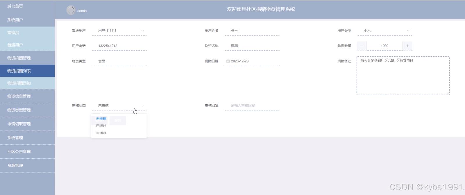 管理员点击“物资捐赠管理”菜单可以用户的物资捐赠信息,包括用户姓名、用户类型、用户电话、物资名称、物资数量、物资类型、捐赠日期、捐赠备注等信息,管理员进行审核物资捐赠信息,审核物资捐赠界面如下所示。