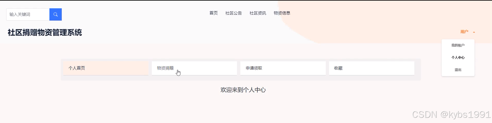 普通用户点击右上角“个人中心”模块,可以查看和管理个人相关的信息和任务,包括个人首页、捐赠物资、申请领取和收藏功能模块。