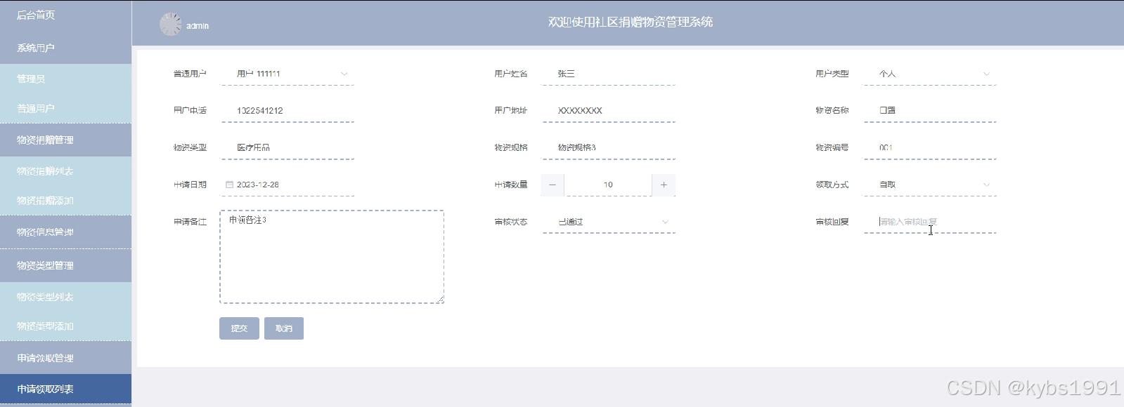 管理员在“申请领取列表”可查看用户的申请领取信息,负责审核和管理社区居民的物资领取申请,包括审核申请信息、分配物资等,确保物资的合理分配和利用,满足社区居民的需求,领取信息审核界面如下图所示。