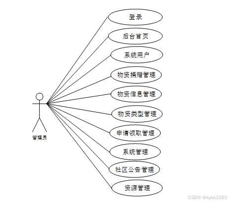 管理员的后台管理模块主要是对前台的注册普通用户和后台的护工用户、医生用户及管理员进行账户信息管理,同时对系统的系统用户、物资捐赠管理、物资信息管理、物资类型管理、申请领取管理、系统管理、社区公告管理、资源管理等信息进行管理。管理员用例图如下所示。