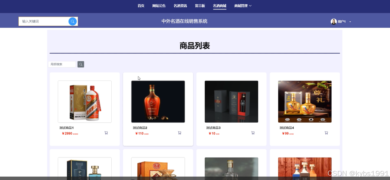 当用户点击“名酒商城”菜单时,可以查看系统中所有的名酒商品,并支持关键词搜索。用户可以点击商城的“详情”按钮查看详细信息,并进行添加购物车、购买、收藏和评论等操作。界面如下图所示。