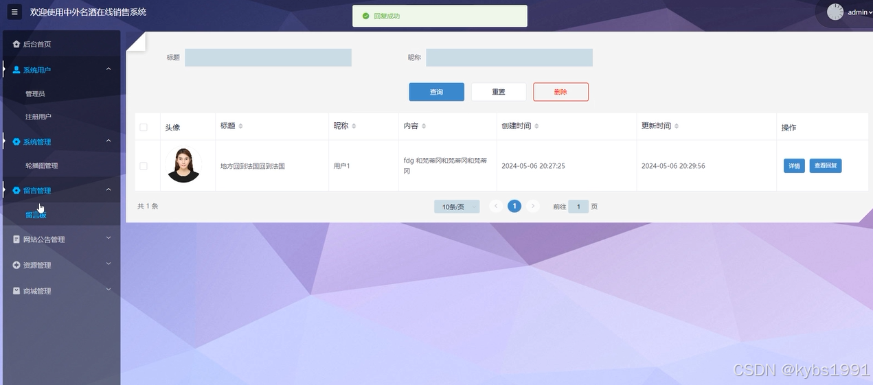 管理员可以查看、回复和删除留言板上的用户留言。比如头像、标题、昵称、内容等,界面如下图所示。