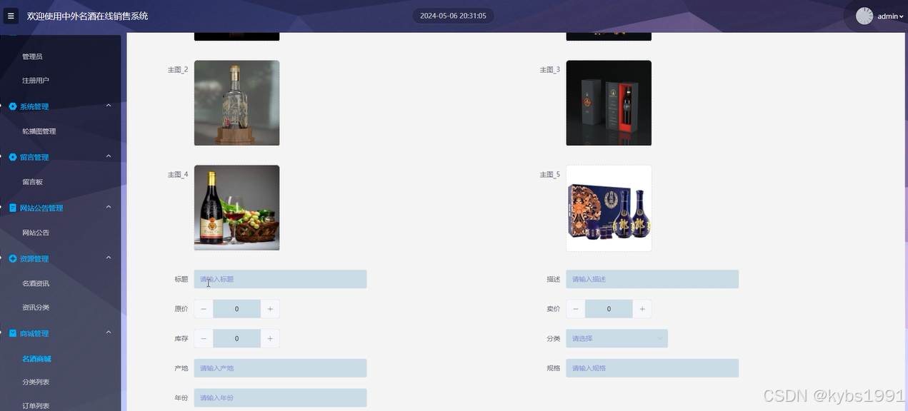 商城管理界面用管理平台上的信息,包括名酒的发布、编辑和删除等操作。管理员可以设置商品的基本信息、价格、库存以及订单分类等。界面如下图所示。