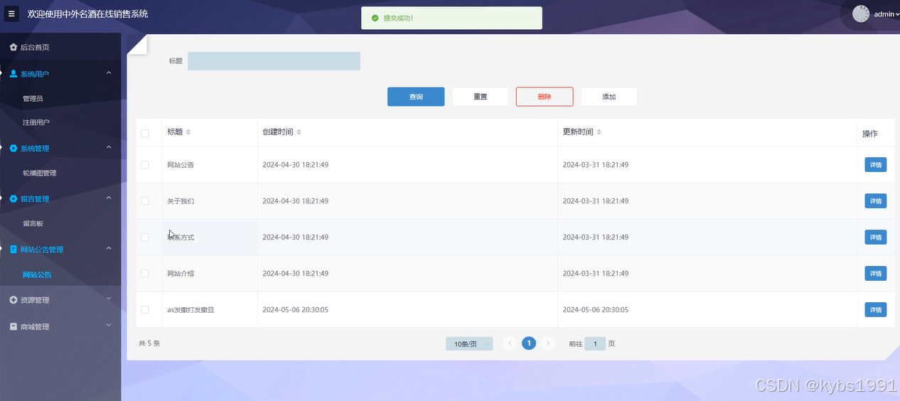 网站公告管理界面用于管理员发布和管理系统的公告信息,包括公告标题、内容和发布时间等。管理员可以添加、编辑或删除公告,并设定公告的有效期。界面如下图所示。
