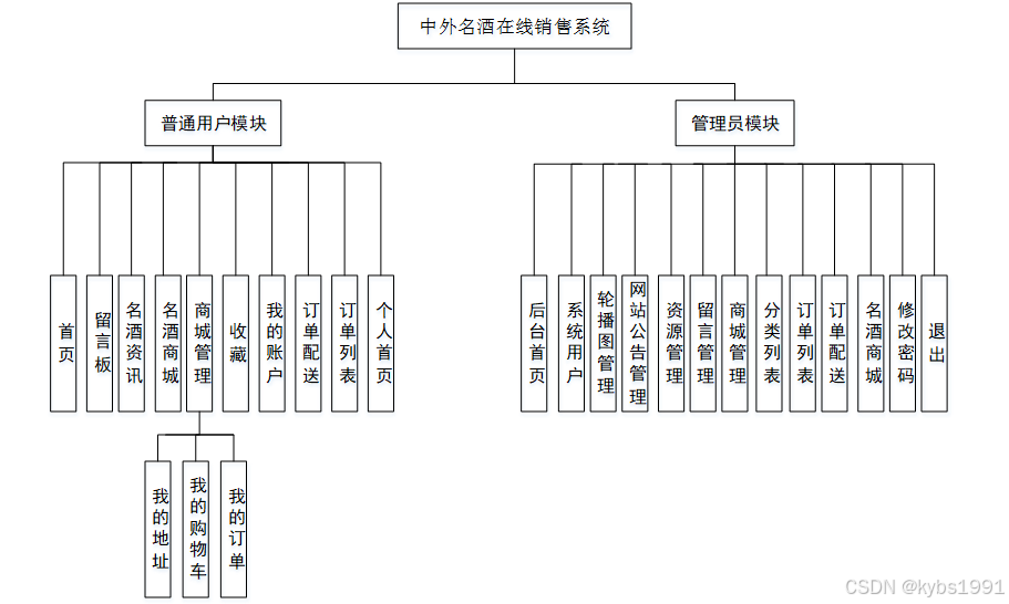 通过整体功能模块设计,我们将根据需求分析的结果,将系统的功能划分为不同的模块。每个模块负责实现特定的功能,并与其他模块进行协作。我们将详细定义每个模块的输入、输出、处理逻辑和相互依赖关系。中外名酒在线销售系统的总体设计模块图如图3-2所示。