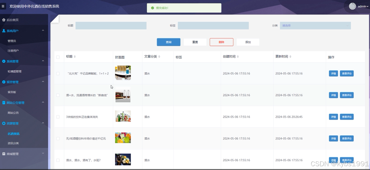 资源管理:包括名酒资讯和资讯分类的管理,管理员可以发布名酒相关的资讯,并对资讯进行分类管理。