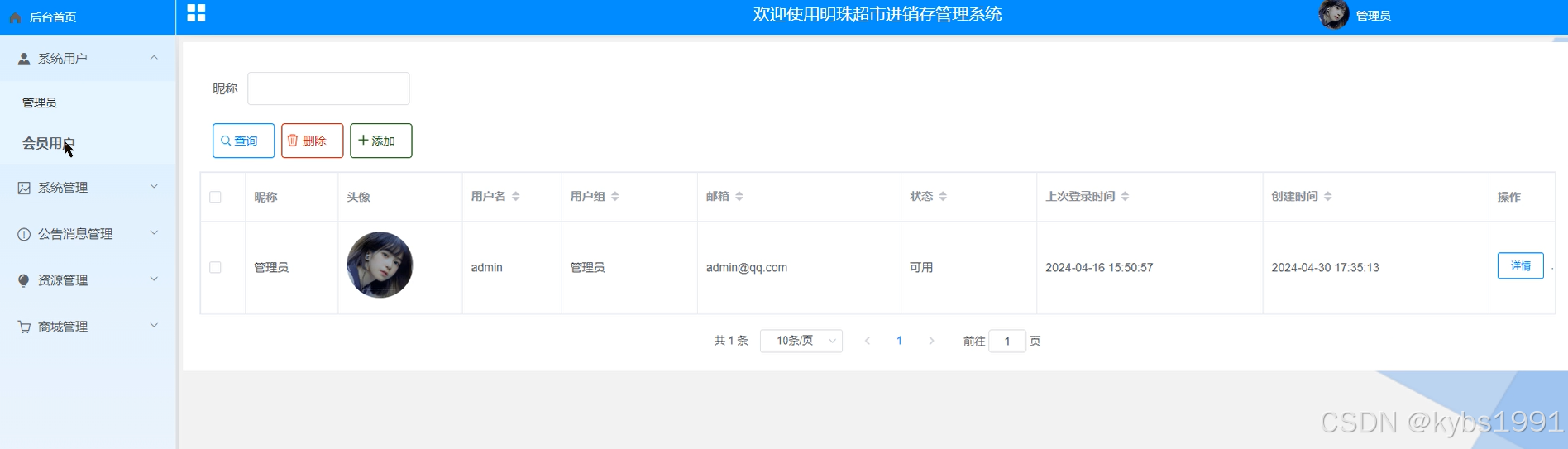 明珠超市进销存管理系统中的管理人员是可以对系统用户进行管理。系统用户界面如下图所示。